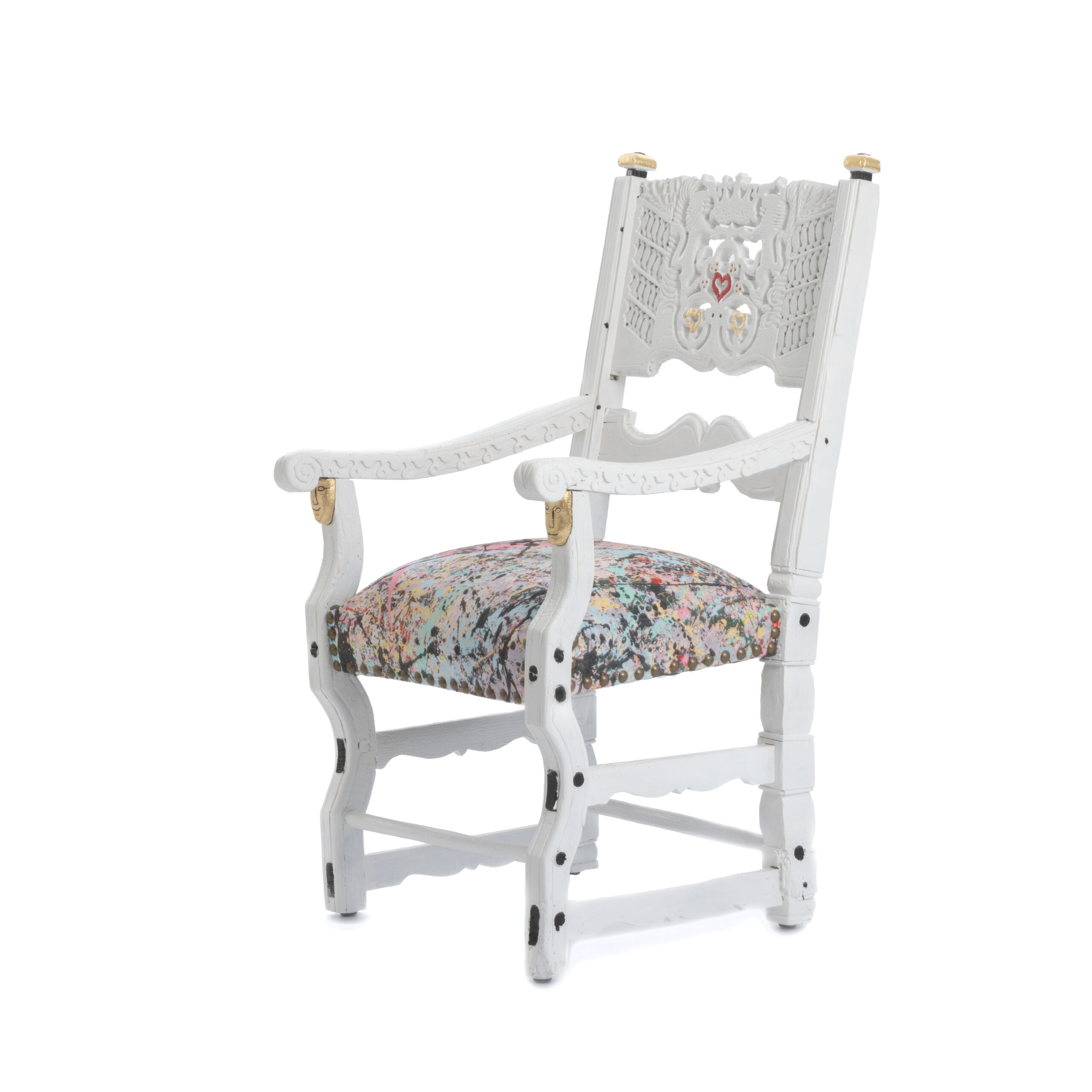 Om de schoonheid van de meubels te benadrukken voegt hij incidenteel details van bladgoud toe. En pas als hij tevreden is, komt er een (lak) vernislaag overheen om de buitenkant te beschermen. Want we spreken over kunstobjecten, maar de originele functie blijft intact. Een zetel blijft een zetel. Het oude, romantische ontwerp in een nieuw, expressief jasje.